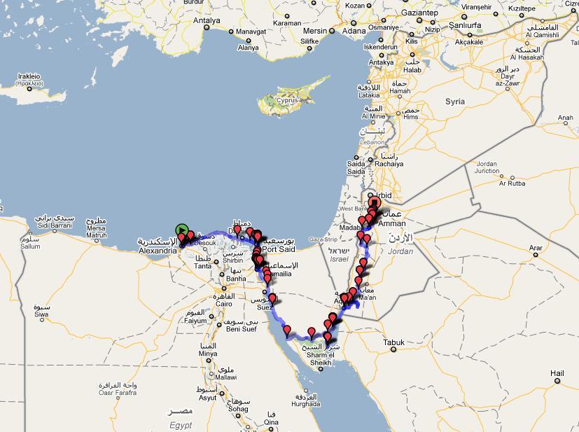 With a quick look at the map I came up with another viable route. With a bit of research I drew up a route crossing from Alexandria in Egypt to Amman in Jordan. So with this set I booked a one way flight to Cairo!