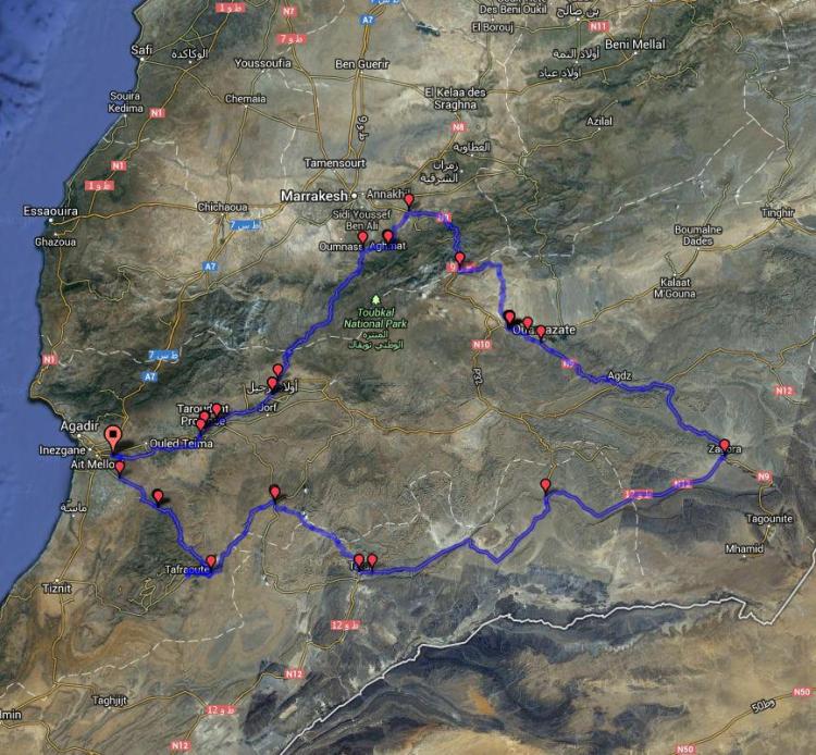 Starting in Agadir, I hoped to head straight across the Souss plains to the High Atlas mountains, crossing the two main passes, Tizi n Test (2100m) and Tizi n Tichka (2260m) in the first 4 days. I would then take a direct route to Zagora at the edge of the Sahara desert where I planned to take a day off to take a 4×4 into the dunes at Erg Chicaga. Once back from this, the plan was to follow a rarely bicycled piste through the desert from Zagora to Foum Zguid. From here I would continue across the desert (via tarmac this time!) to Tata and then climb up into the mountain villages of Igherm and Tafraoute before descending back to Agadir airport. The whole loop was over 1200km and I would have 13 days of cycling to complete it.