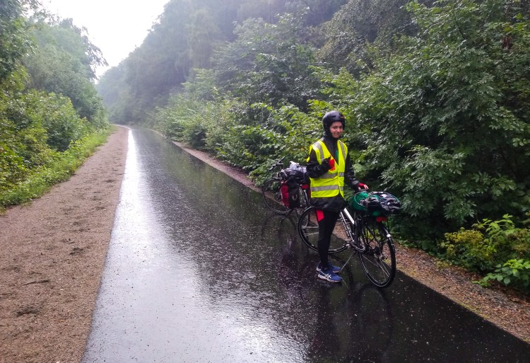 There was torrential rain falling and streams of water running down the rail trail towards the town of Båstad, an appropriate town name for the curses we had pent up inside of us as we pedalled downhill into the pouring rain.