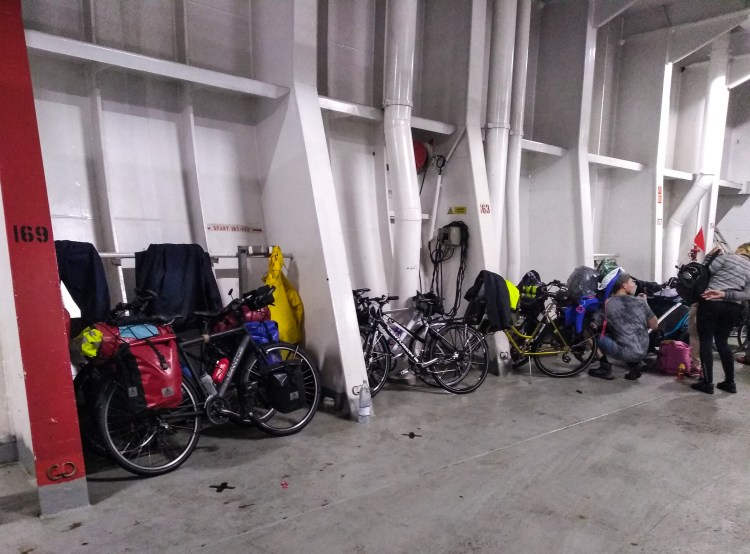 We arrived at the ferry terminal already soaked through, so rushed onto the boat, stored the bikes and headed to the ship’s cafeteria to dry off.