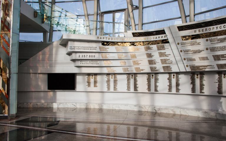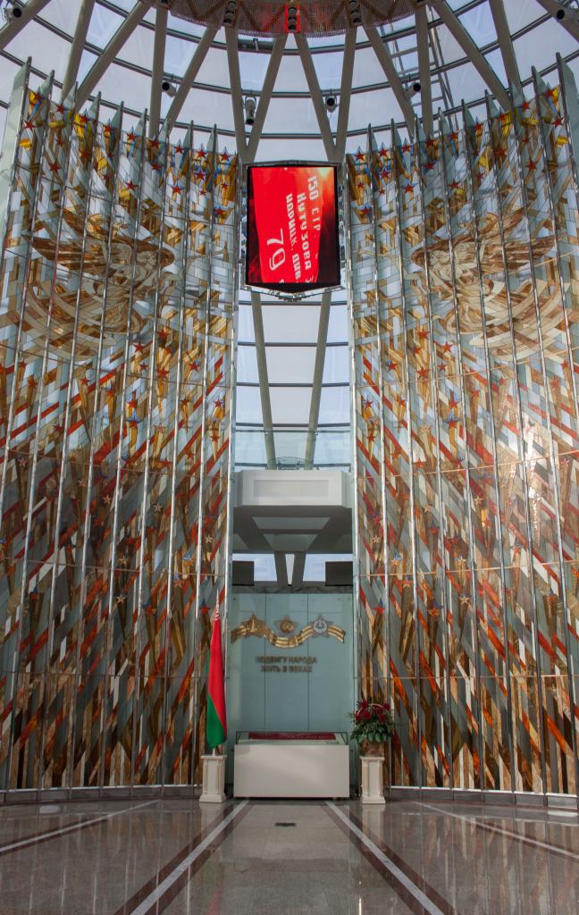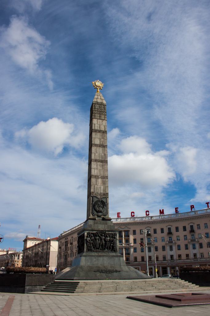 Victory Square holds Minsk’s largest monument to the Soviet soldiers who lost their lives defending Belarus during World War Two. Above the surface stands a 38 metre obelisk with a 3 metre replica of the “Order of Victory” (the highest military decoration awarded for World War Two service in the Soviet Union) sitting on top. Beneath the surface lies a memorial hall with a highlighted glass wreath at its centre. Adorning the walls are the names of all 566 natives from Belarus who earned the title of “Hero of Soviet Union” for their deeds during the war.