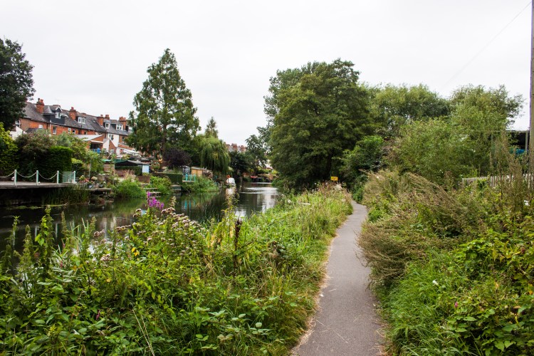 By the time I had finally eaten and packed, it was already 09:30 a.m. when I was leaving the hotel. I set off out of Reading, carefully navigating the junction of the previous day – giving a wide berth to any wayward taxis – before turning onto a series of quiet canal paths. These wound southwards out of Reading, passing by rows of beautiful houses with their gardens leading right down to the water’s edge.