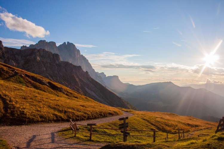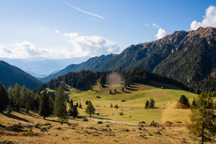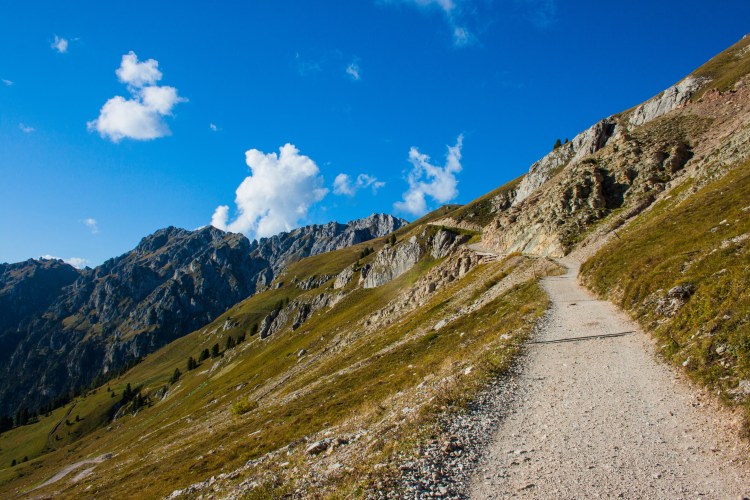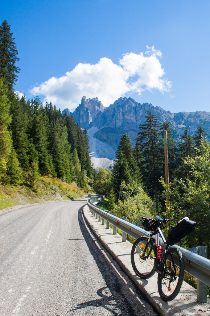 Upon reaching the base of these peaks, the route took a turn down a steep, gravelly track through more coniferous forest. As I reached the bottom of this descent the trees peeled away to my left to reveal another magnificent, wider vista of these peaks with green meadows leading up to them. I was only half-way through my first day in the Dolomites and even if my back injury put a stop to my journey right then, I could have travelled back home a happy man. These views were nothing short of incredible. I couldn’t help but smile widely as I cycled beneath these majestic peaks.