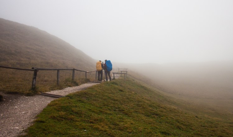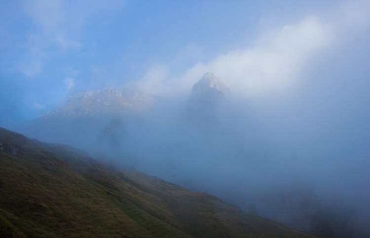 The rain thundered down heavily all night, waking me up at points due to its intensity. So, sure enough, when I emerged from the Rifugio in the morning it was into a different world than the sun-baked hillside of the previous evening. Instead heavy fog now obscured all around me apart from the Rifugio itself, the structure of now sodden wood alone, an island in a sea of clouds, seemingly cut adrift from the world up here above 2,300 metres.