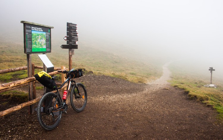 From the top of this hill, I was able to start cycling again. For the next twenty minutes, I followed some rough singletrack which swept along like a rollercoaster through the clouds. Occasionally, the clouds would part briefly allowing me a view down to meadows and alpine huts far below me before the clouds would sweep in, hiding everything from view again