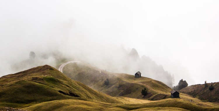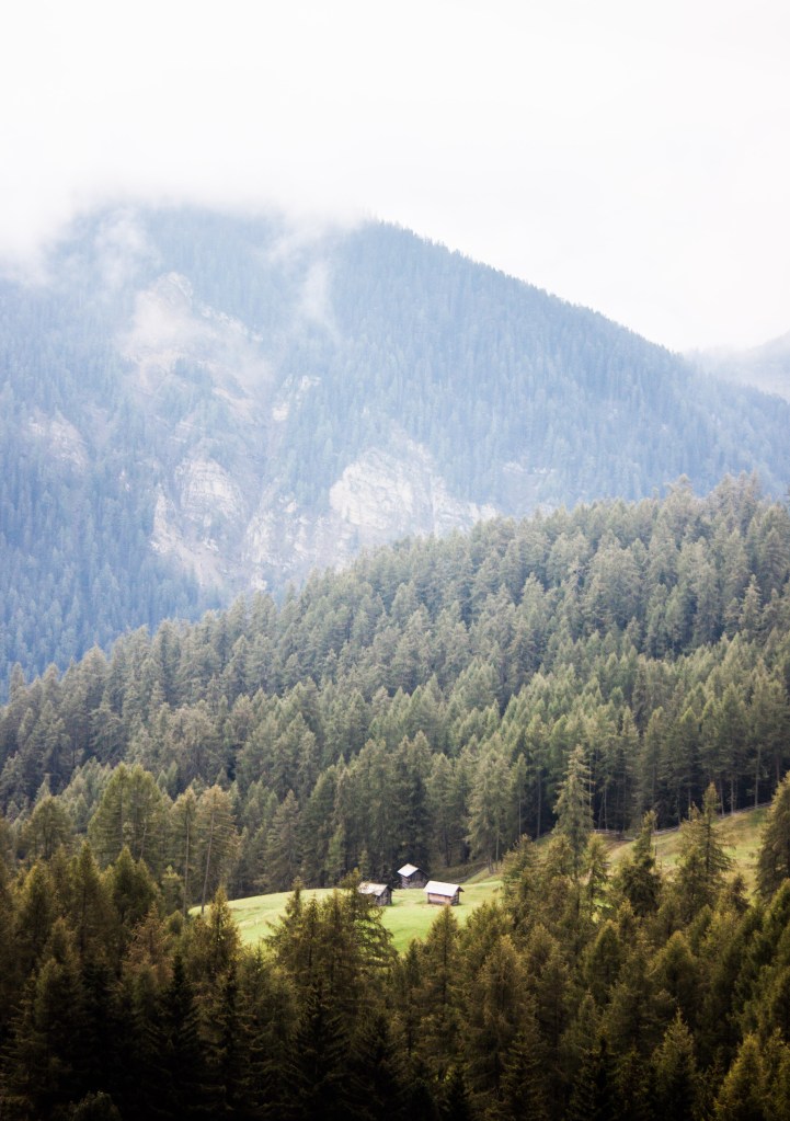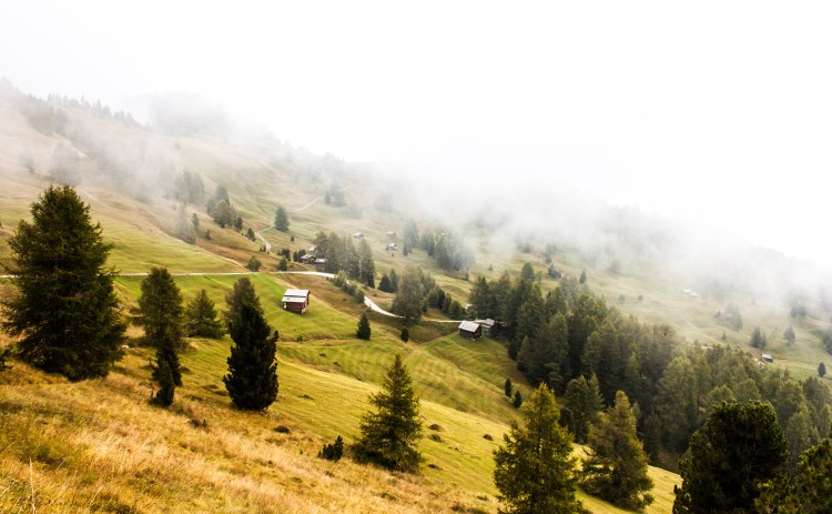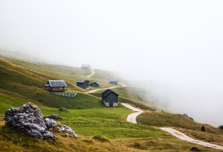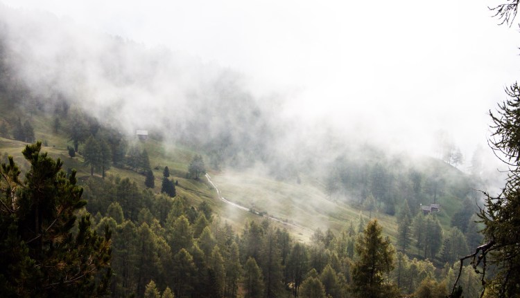 Down out of the higher mountains and onto smoother gravel tracks now, I cruised through beautiful meadows, at one point seeing a chunky marmot running away upon hearing me and hiding under an alpine hut. I continued along, sweeping through the clouds until finally I lost enough elevation to be dropped out of this mist-filled world and could see the village of Longiaru far below.