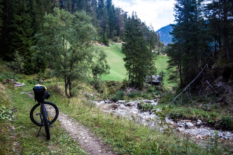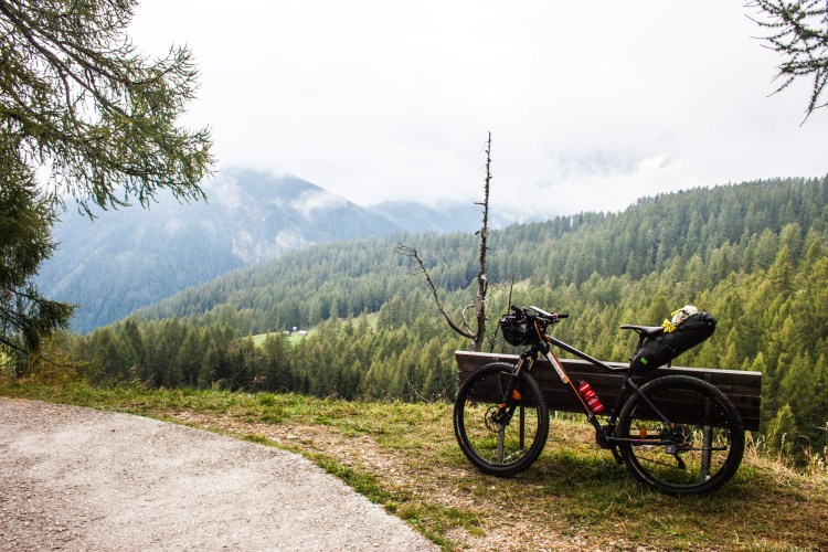 After a continental breakfast and coffee, I loaded my bicycle and began pushing up some steep singletrack. The Schlüterhütte soon vanished from view behind me, swallowed up by the drifting clouds.