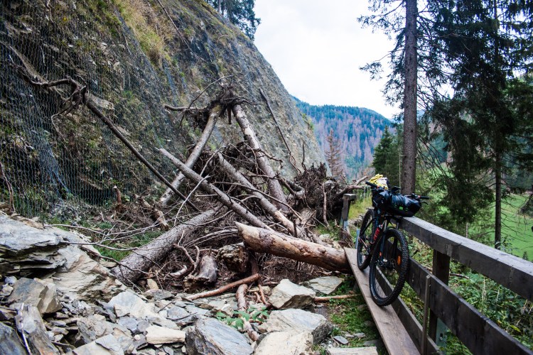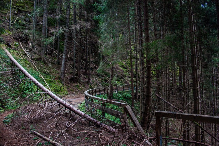 From the ski village of Piccolino, the Trans-Dolomiti route followed a trail high up the steep river valley, meanwhile the busy main road stuck to the base of the valley. When I arrived at the start of this trail, I found a sign stating that it was closed. Not one to let things like this stop me, I continued until I came across some barriers stating that this track really was closed! The barriers had been pushed aside though, and this surely had to be for a reason, so stubbornly I continued on. A bit further on, I came across some boulders which had been placed across the trail, just in case anyone hadn’t got the message that the trail was closed!